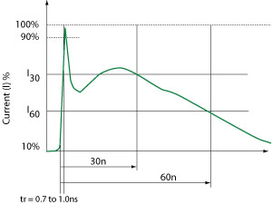 闪电的指数上升时间在1.2μsec到10μsec的范围内(基本上是10%到90%),持续时间在50μsec到1000μsec的范围内(峰值的50%)。另一方面,ESD是持续时间短得多的事件。上升时间小于1.0ns。总持续时间约为100ns。